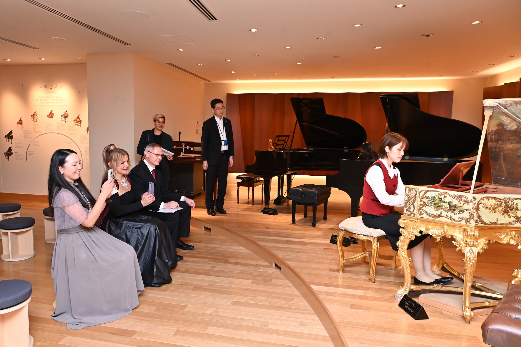 Avant le concert, l’Ambassadeur Hrastic, Mmes Lovric et Toyama ont rencontré M. Koji Yamaguchi, Président de Min-on, ainsi que plusieurs cadres de l’association. Ils ont ensuite visité la collection de la bibliothèque musicale de Min-on, admirant les pianos classiques et les autres instruments de musique exposés.